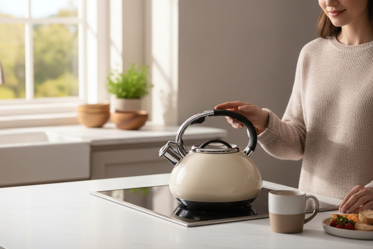 Jego zaletą jest szeroka podstawa, dzięki czemu gotowanie wody jest szybsze i energooszczędne.
