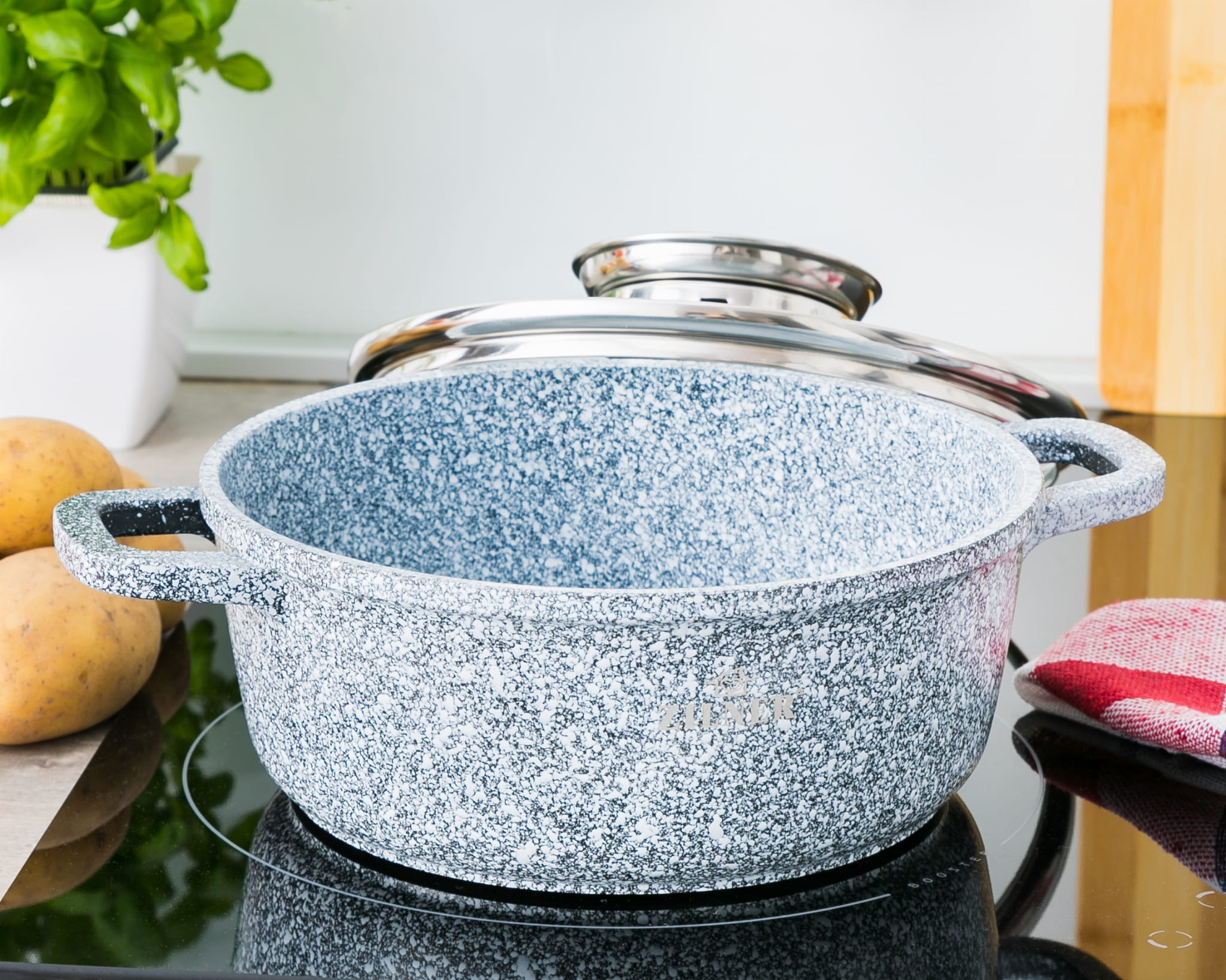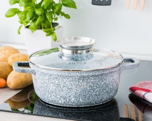 Obecnie wysokiej jakości i średniej pojemności naczyniem kuchennym jest garnek ceramiczno-marmurowy ZILNER ZL-7089. Stworzony jest z wyselekcjonowanych materiałów, odznacza się nowoczesnym designem i zachwyca ponadczasowym kolorem (marmurowy szary). Posiada funkcjonalne rączki ułatwiające trzymanie naczynia oraz innowacyjną szklaną pokrywę. Garnek ZILNER ZL-7089 bez problemu odnajdzie się w każdym wnętrzu kuchennym – doda mu luksusowego charakteru, zadba o sterylne warunki i pozwoli zaskoczyć Twoich gości. Garnek ceramiczno-marmurowy ZILNER ZL-7089 wykonany jest z najwyższej jakości aluminium i dodatkowo posiada powłokę ceramiczno-marmurkową odporną na korozję. Nieprzywierająca powłoka o dużej twardości oraz grube indukcyjne ferromagnetyczne dno garnka umożliwiają szybkie, sterylne i wyjątkowo wygodne przyrządzanie pełnowartościowych posiłków.