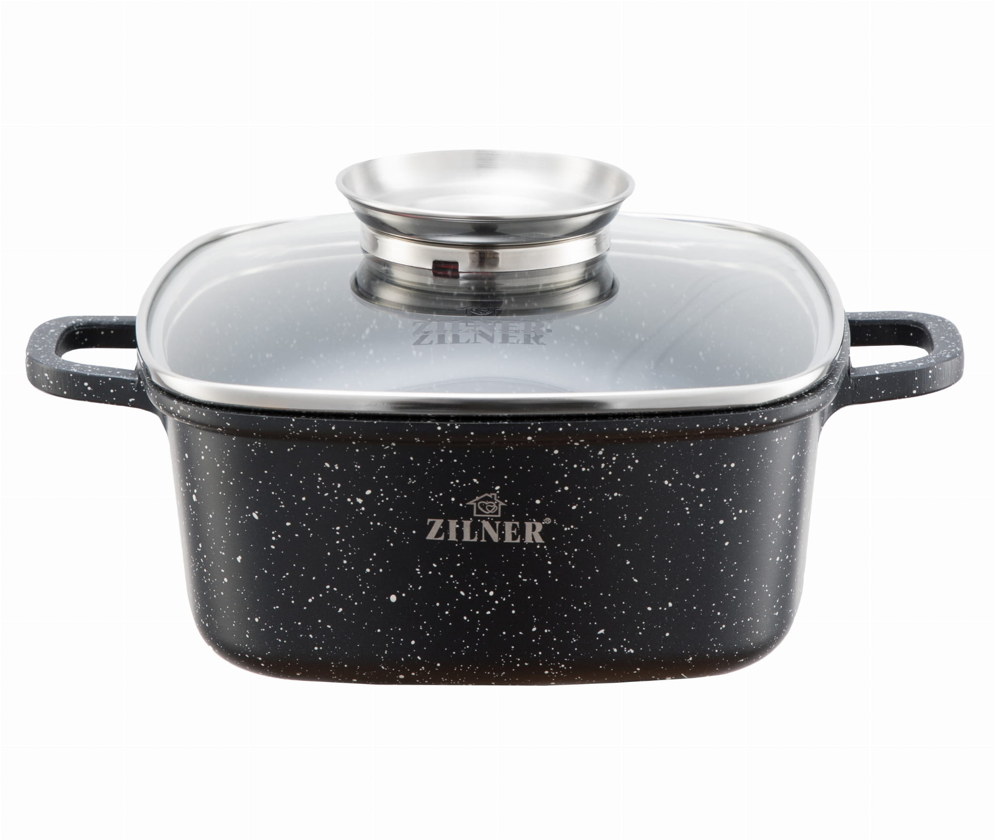 Kwadratowy garnek z marmurową powłoką nieprzywierającą ZILNER ZL-9008 sprawdza się na wszystkich rodzajach kuchenek - halogenowych, ceramicznych, gazowych oraz indukcyjnych. Umożliwia gotowanie, duszenie i smażenie bez użycia dużej ilości tłuszczu – doskonałe rozwiązanie dla osób odchudzających się, dbających o sylwetkę i diabetyków. Za sprawą marmurowej i nieprzywierającej powłoki, chroni przed przypalaniem i przywieraniem jedzenia do powierzchni naczynia. Dodatkowo nie wchodzi w reakcję z żywnością dzięki temu nie przyczynia się do zmiany smaku i utrzymuje najcenniejsze właściwości odżywcze posiłków. Kwadratowy garnek z marmurową powłoką nieprzywierającą ZILNER ZL-9008 wyposażony jest w szklaną pokrywę ze specjalnym wlewem na przyprawy AROMA KNOB. Tego typu unowocześnienie pozwala w dowolnej chwili podczas przyrządzania posiłków dolewać/dosypywać oleje, przyprawy i zioła.