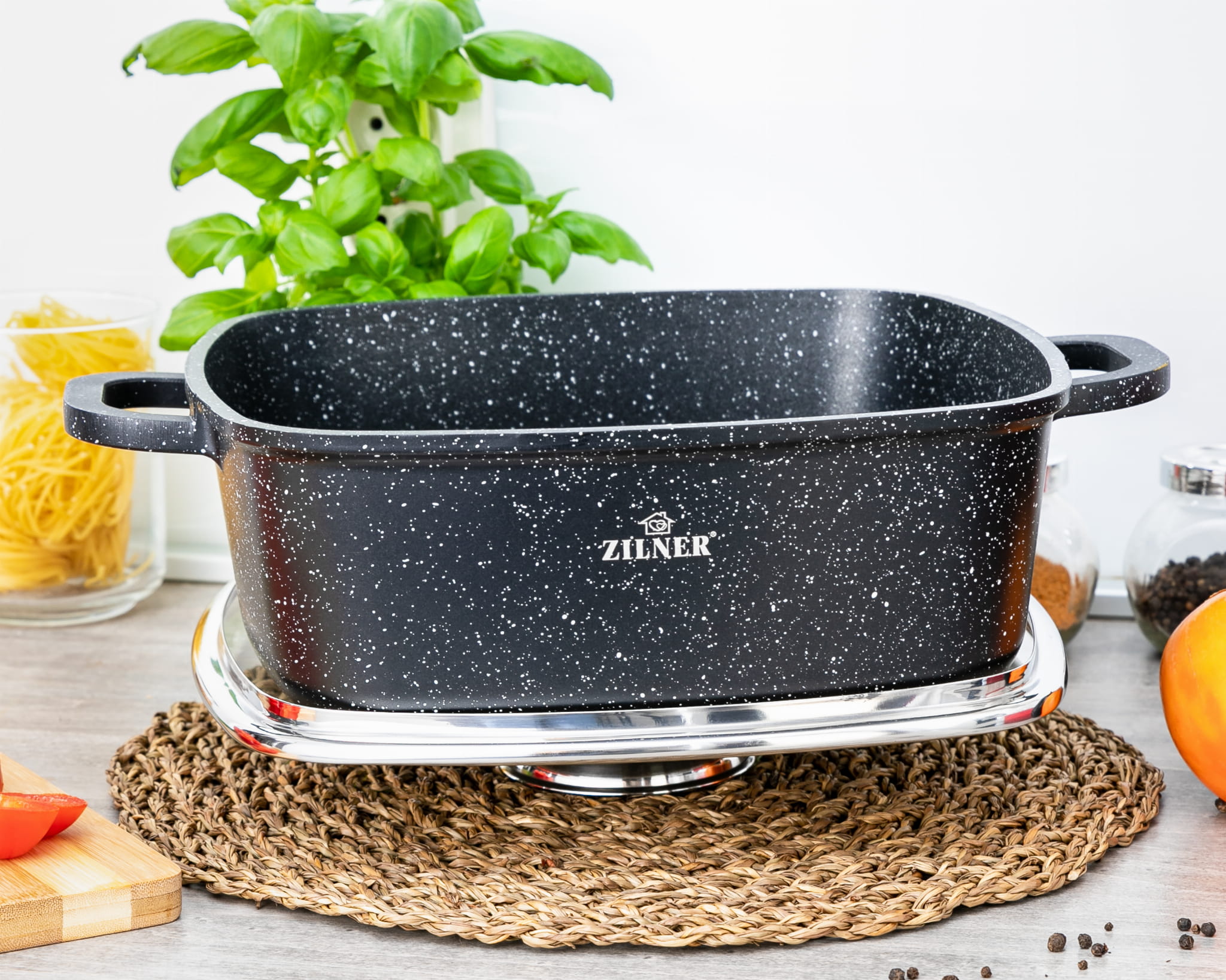 Ekskluzywny kwadratowy garnek ZILNER ZL-9012 pozwala przygotowywać zdrowe i aromatyczne potrawy dla całej rodziny, świetnie komponuje się z każdym wnętrzem kuchennym i dodaje mu awangardowego charakteru. Zachwyca niecodziennym kwadratowym kształtem, modnym kolorem (marmurowy czarny) oraz licznymi funkcjami (wlew AROMA KNOB, odpowietrznik). Garnek marmurowy ZLINER ZL-9012 to niezwykle pojemne naczynie wykonane z wysokiej jakości aluminium i powlekane powłoką odporną na korozję. Wyróżnia się specjalną konstrukcją dna, która zapewnia doskonałe przewodzenia ciepła i uzyskanie równomiernej temperatury na całej powierzchni. Ponadto odznacza się wyjątkową wytrzymałością, odpornością na działanie bardzo wysokich temperatur oraz spełnia właściwości antybakteryjne (fizyczne i chemiczne).