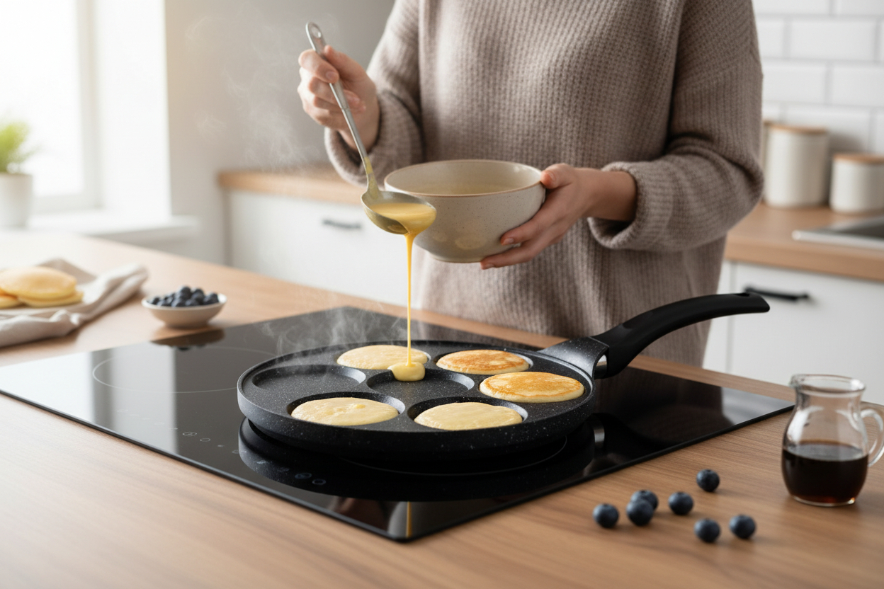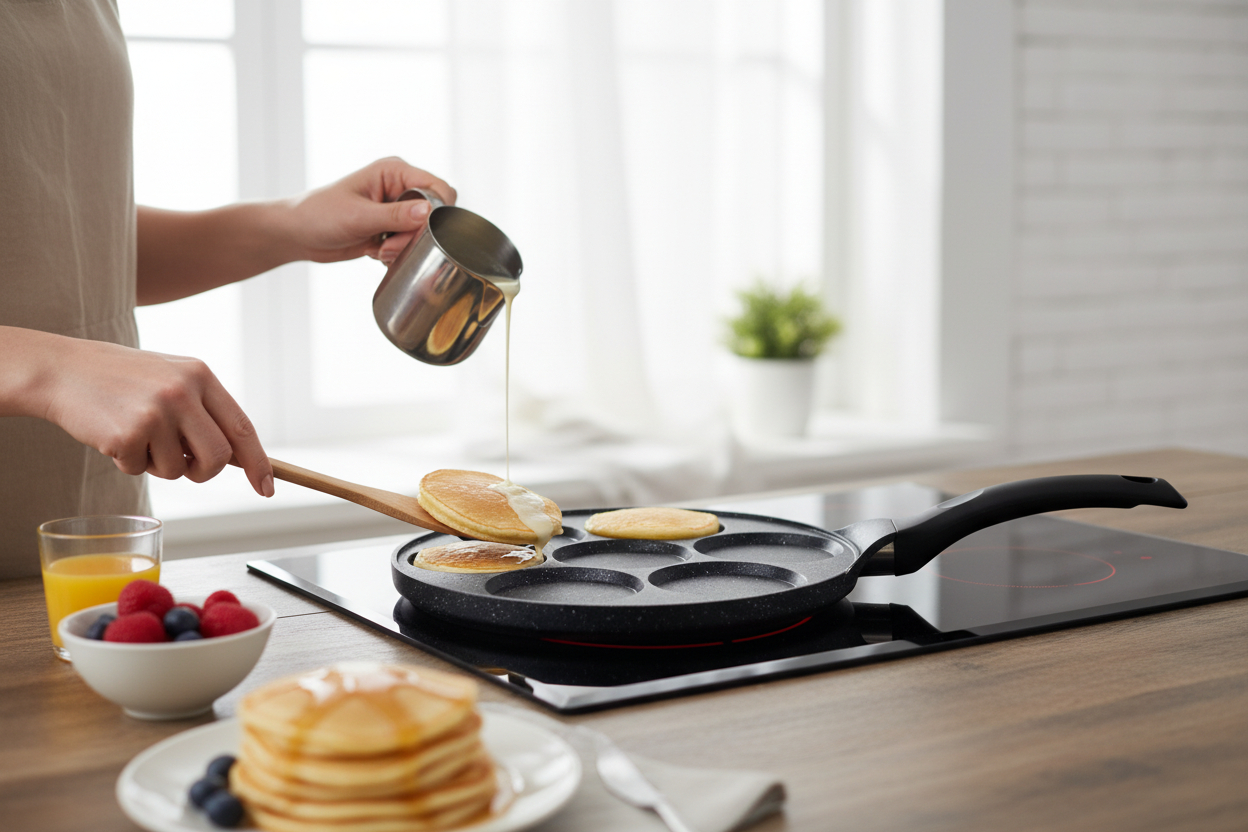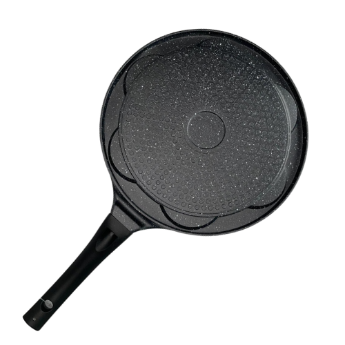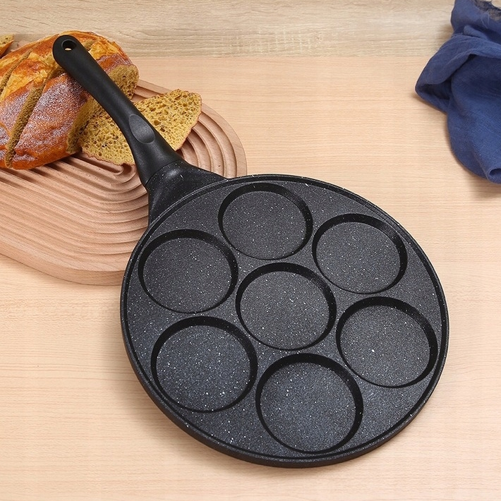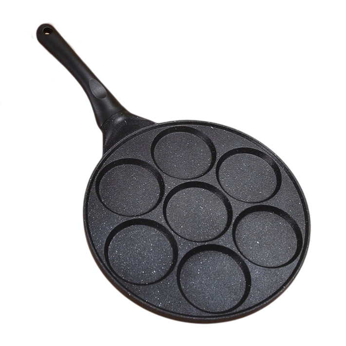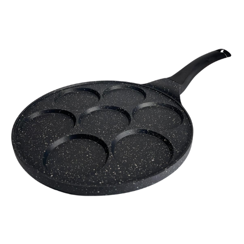 Powierzchnia patelni została podzielona na siedem okrągłych wgłębień, dzięki czemu idealnie nadaje się do robienia pancakes, placuszków, jajek sadzonych czy mini omletów – wszystkie wychodzą równe i estetyczne. Ergonomiczna, nienagrzewająca się rączka zapewnia wygodny i bezpieczny chwyt podczas smażenia.