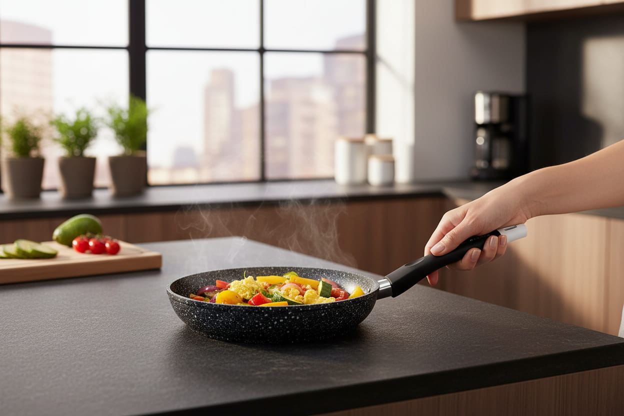 - Ergonomiczny uchwyt patelni wykonany w technologii Soft-Touch pokryty został powłoką antypoślizgową, która zapobiega wyślizgnięciu się patelni z ręki