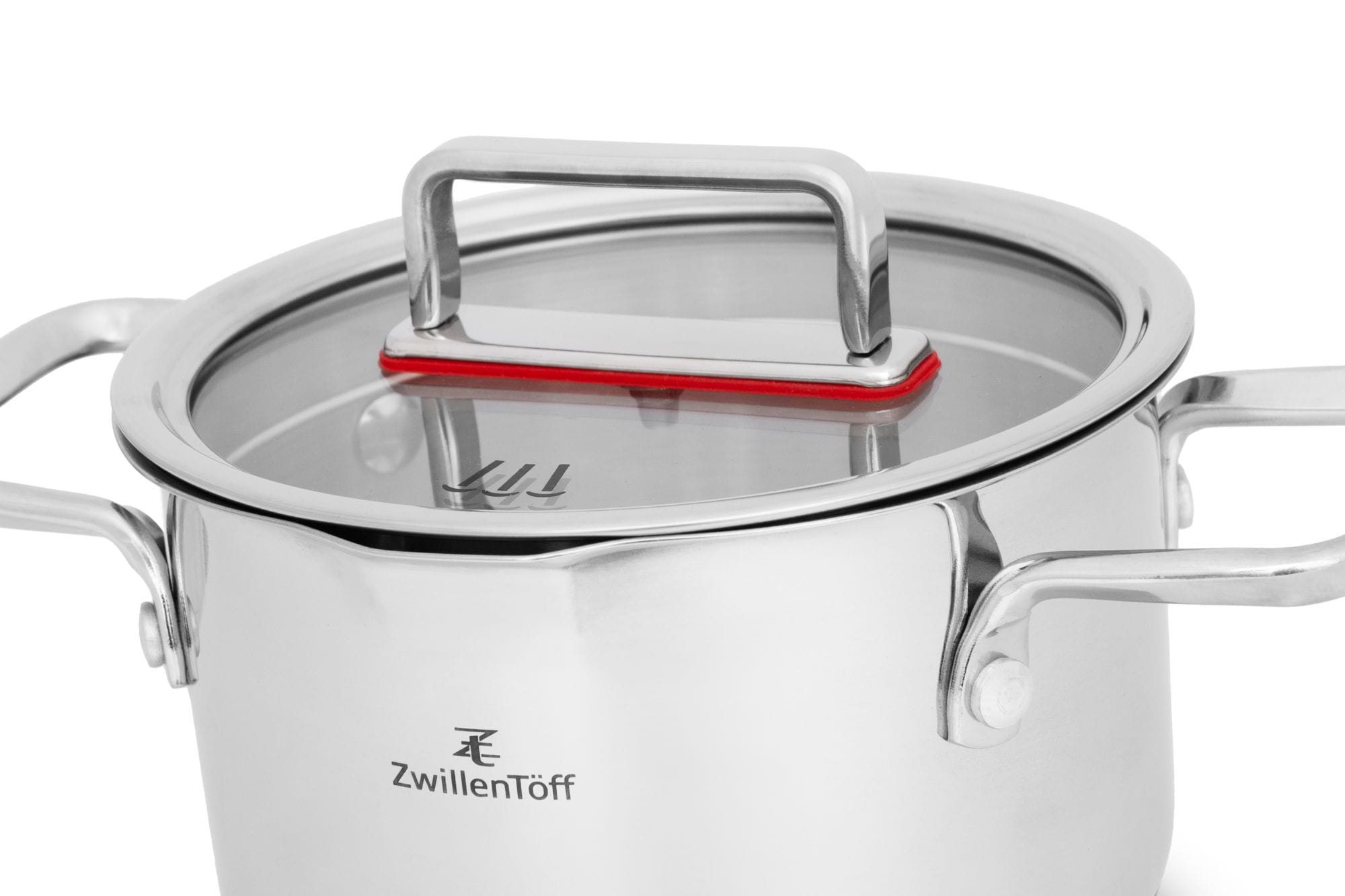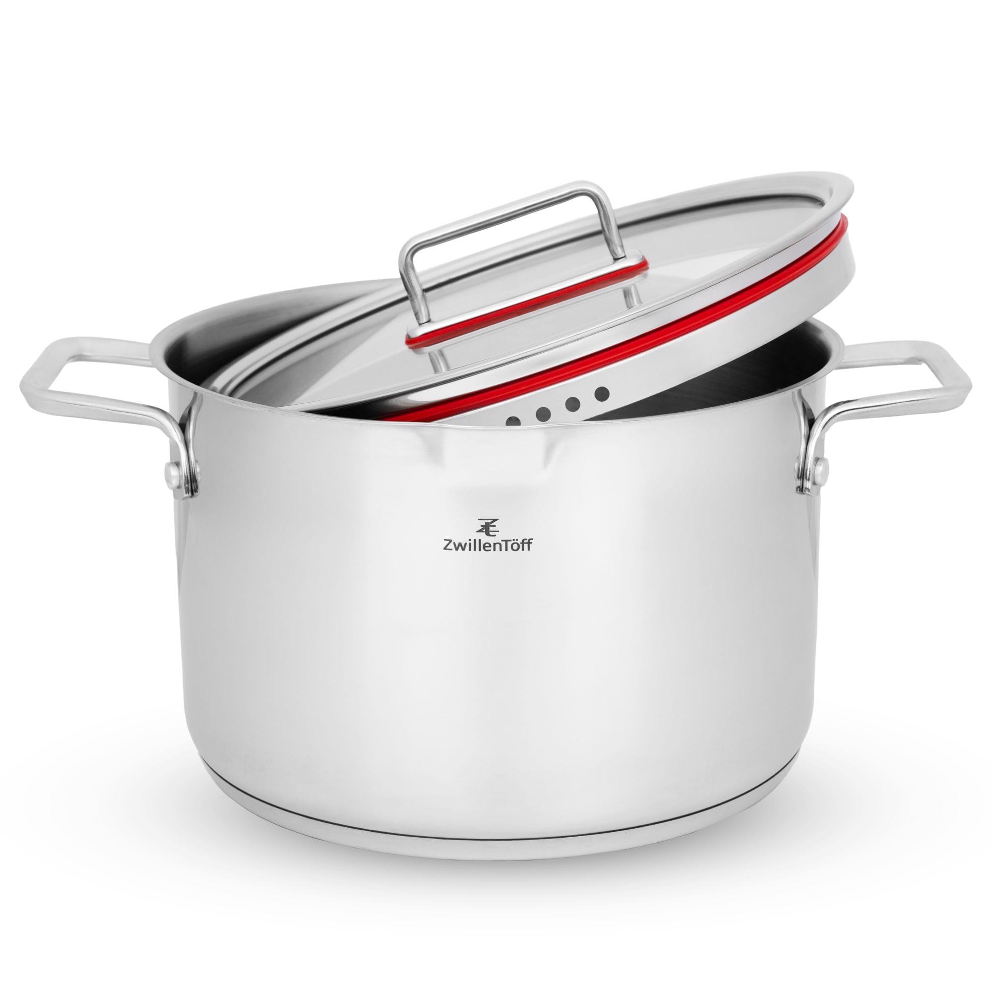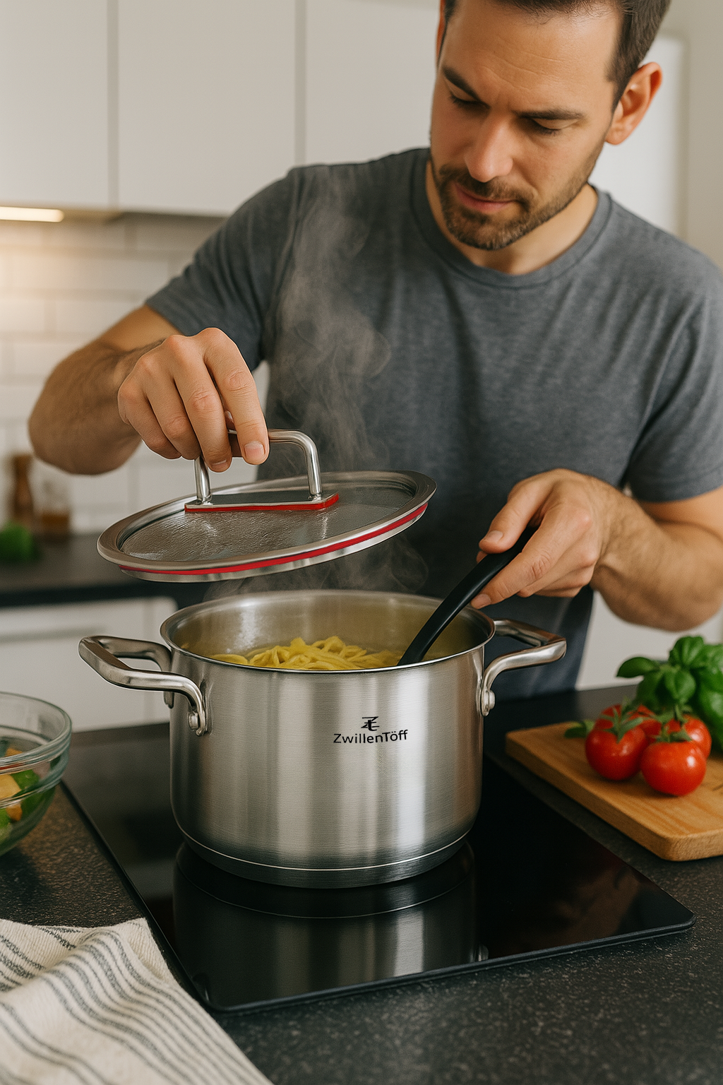 Każdy garnek wyposażony jest w dopasowaną pokrywkę z metalowym uchwytem oraz kolorowym pierścieniem silikonowym, który poprawia szczelność i komfort użytkowania. Solidne, ergonomiczne uchwyty zapewniają pewny chwyt podczas gotowania i przenoszenia.